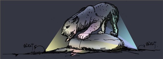 《狼來了》百匹狼群,以重點照明的方式著重刻畫頭狼及狼群的氣勢。狼群的后部,在狼眼處涂抹熒光粉,配合黑光燈,使狼眼在黑暗處散發(fā)出寒光。從整體上感覺狼群漸漸從黑暗中走出,給人一種狼來了的動態(tài)氣勢。