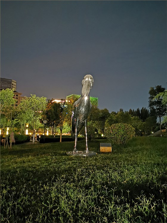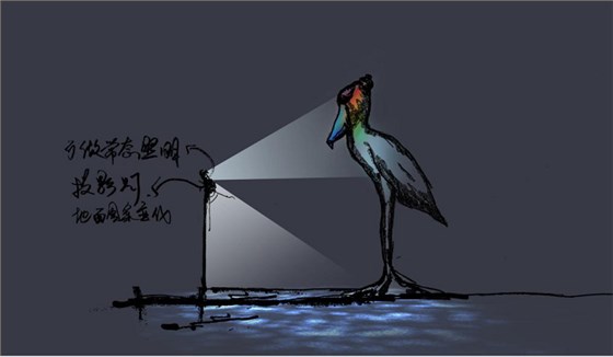 《鯨頭鸛》用水紋燈映亮雕塑周圍環(huán)境,以彩色小型投光燈對雕塑局部染色,一副艷麗的鯨頭鸛在河邊休憩的場景便映入眼簾。