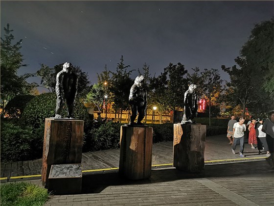 《高山流水》青銅雕塑,參考秦兵馬俑的照明手法,以白色燈光重點照亮雕塑頭部,仿佛在迎著陽光沉思。
