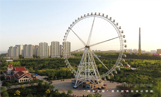 的精髓在于空間,而空間的精髓在于光。每當夜晚降臨,彩燈閃爍,摩天輪一圈圈地劃過點亮丹東最美天際線,顯現出其非凡的魅力,一個條形分明且帶有鏤空形式的立體空間,用光去逐步表現它變化的豐富表情,用光去逐步配合它轉動的動感韻律,轉輪鑲嵌著燈光緩緩移動,座艙伴隨著底部光暈漫步暢游,亮化完成摩天輪的觀景照明效果相當突出,而在絢麗多姿、變幻無窮的燈光照明亮化點綴之下,“丹東之眼”成為中朝邊境上耀眼的明珠。