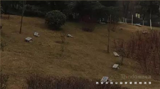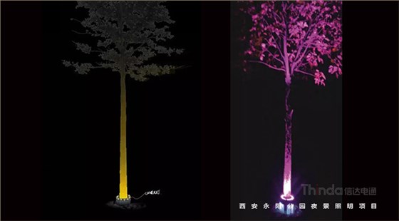 對于茂盛的樹木,建議從外部進行面光照射,勾勒出樹木的形狀也強調了其質感。草坪燈和投光相結合的燈具,既滿足道路照明又能將樹木打亮;