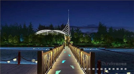 永陽公園的亮化使用綠色智控系統。燈光材料的選擇是根據被照物的具體情況選用低耗能的LED、EL光源和用紫外線照射發光的熒光涂料做裝飾照明。