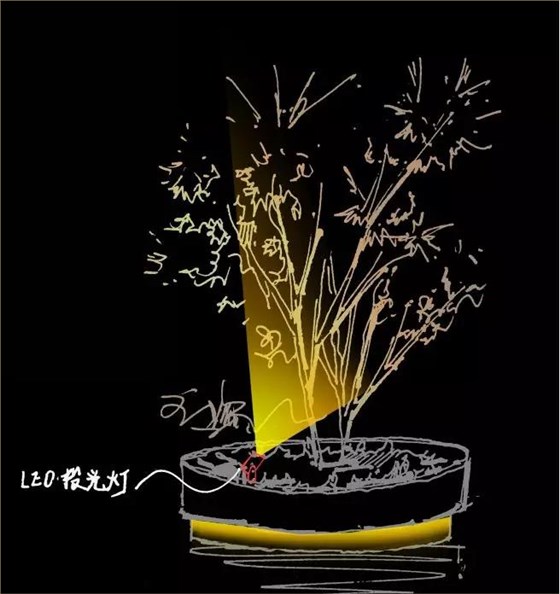 綠植景觀柱依據其構造,進行分層照射,在燈具上采用小型投光燈將基座和頂部綠植部分分層打亮,頂部架投影燈營造氛圍照明;