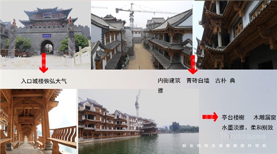 新樂市雞鳴古城黑瓦白墻、青磚門罩、木雕漏窗與建筑物融為一體,展現(xiàn)徽派建筑的端莊文雅、溫馨別致的藝術(shù)風(fēng)格,展現(xiàn)人行視點(diǎn)的直觀感受。具備古典情調(diào)的雅致,給人們帶來的是休閑逸致與感官享受。根據(jù)古建筑燈光整體考慮,強(qiáng)化建筑帶給人們的夜間美,打造具有人文自然、觀賞體驗(yàn)、休閑雅致、情感交流的夜間情境式體驗(yàn)氛圍。