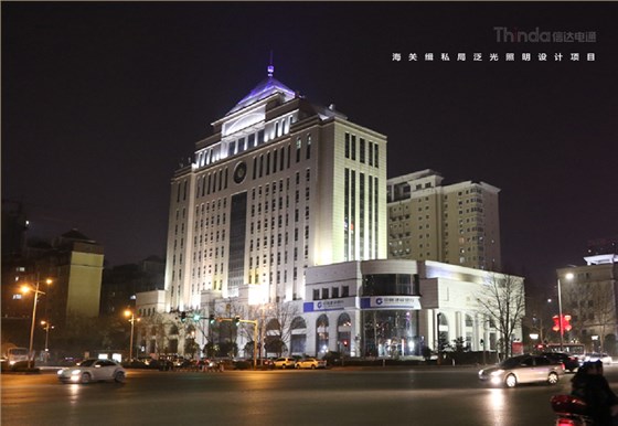 經過信達電通夜景照明設計師泛光照明改造工作后,建筑照明層次清晰,明顯能夠體會到建筑厚重感在燈光修飾下的體現,建筑主體正面上部中心處代表緝私局的商標被重點突出,這樣能夠獲取注意力的吸引,而不是依靠附屬的建設銀行起到代表的作用,建筑主體的身份代表得到回歸。