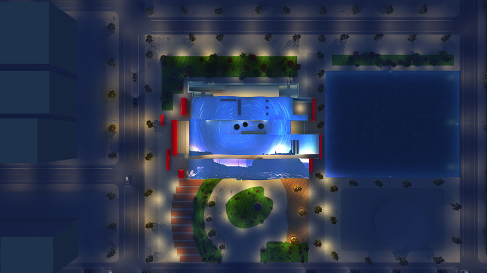 廣場燈光從色彩上尋求變化,增加燈光與人的完美互動。區域以高亮度照明呈現,節假日以彩光呈現,突出入口標識性設計。廣場綠植依據植物的大小形態進行燈光設計,燈具隱藏,綠色生態,營造舒適的夜間光環境。