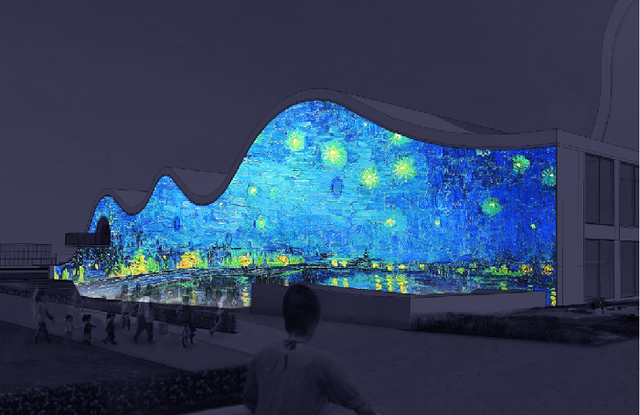 梵高的《星空》在建筑西立面的整體幕墻進行投影,充滿了運動和變化,從視覺上為每個少兒的心靈描繪出藝術的圣殿。