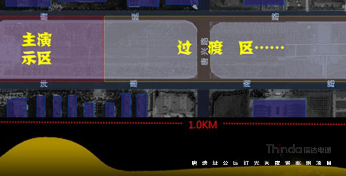 西安高新區北廣場區域為燈光秀的重要核心,往南后逐漸弱化,直至延平門廣場后落幕,同時兩側高層建筑頂部燈光顏色變化與整場燈光秀節奏相呼應。項目位于西安市高新區核心區域,由科技路、唐延路、科技一路、灃惠南路相環繞而成,結合西安地域文化特色,以文化為內涵,讓傳統文化與現代信息交互向榮,將廣場簡稱一個高起點的、具有時代氣息的、娛樂休閑賞景相結合的文化中心場所,配合兩側建筑照明,充分展示西安的城市新形象。